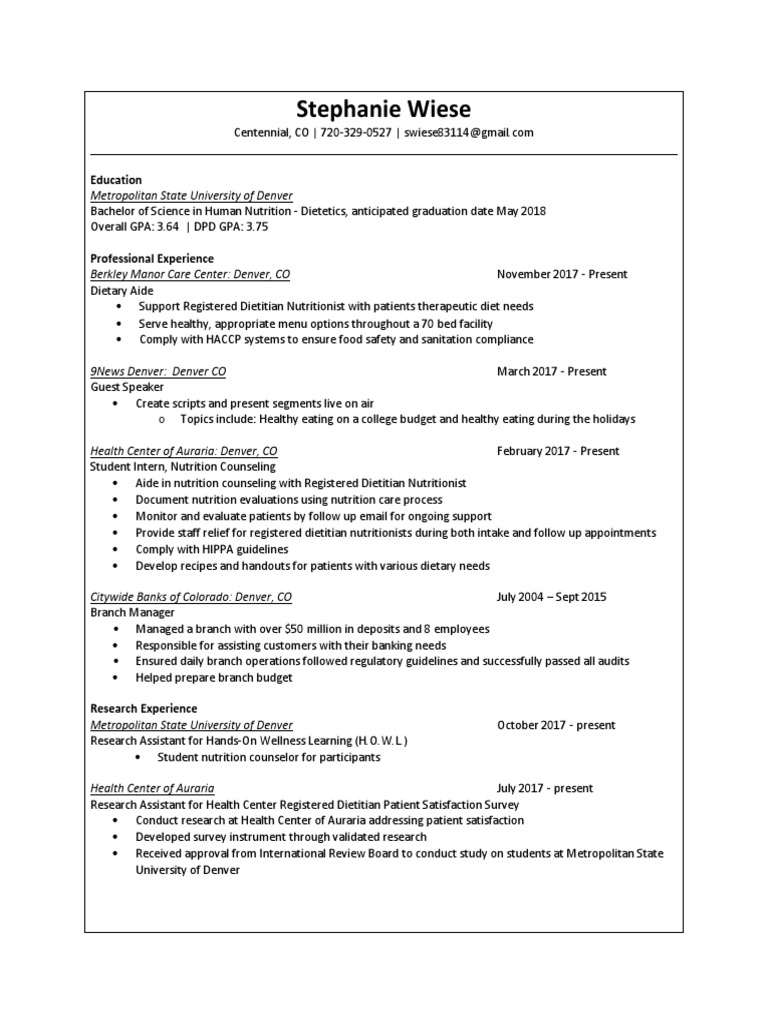 Stephanie Msu Resume 2018 PDF Dietitian Health Care