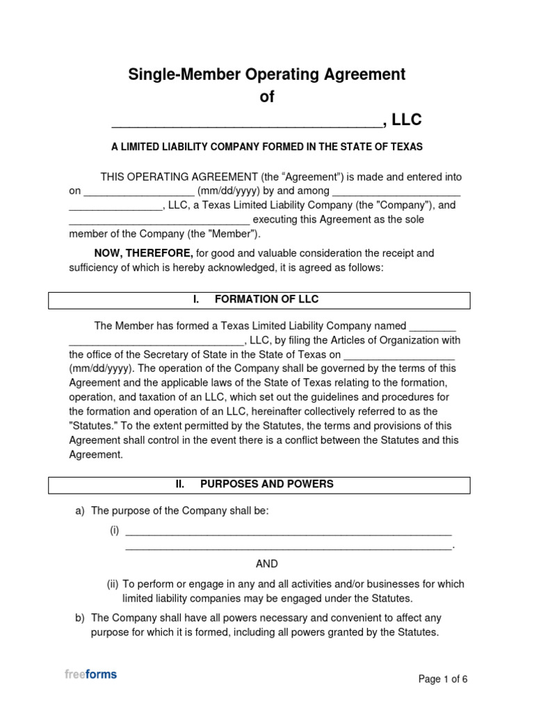 Texas Single Member LLC Operating Agreement Template Fill Out Sign