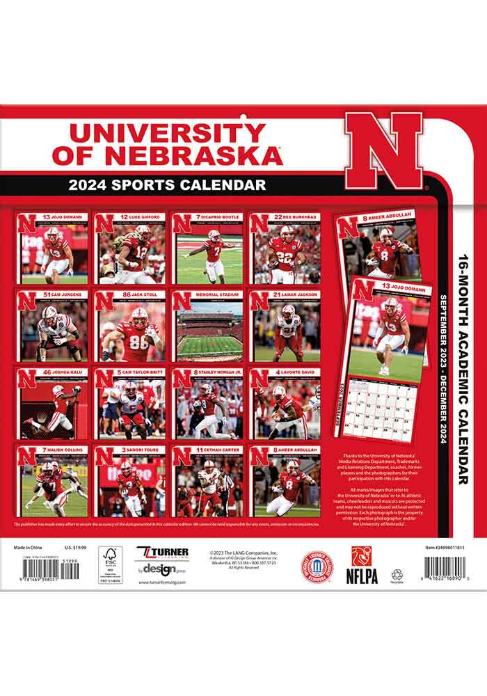Nebraska Cornhuskers 2024 Team Wall 12x12 Calendar