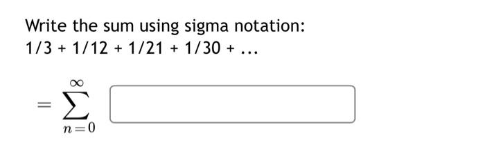 Solved Write the sum using sigma notation: 1/3 1/12 1/21 Chegg com