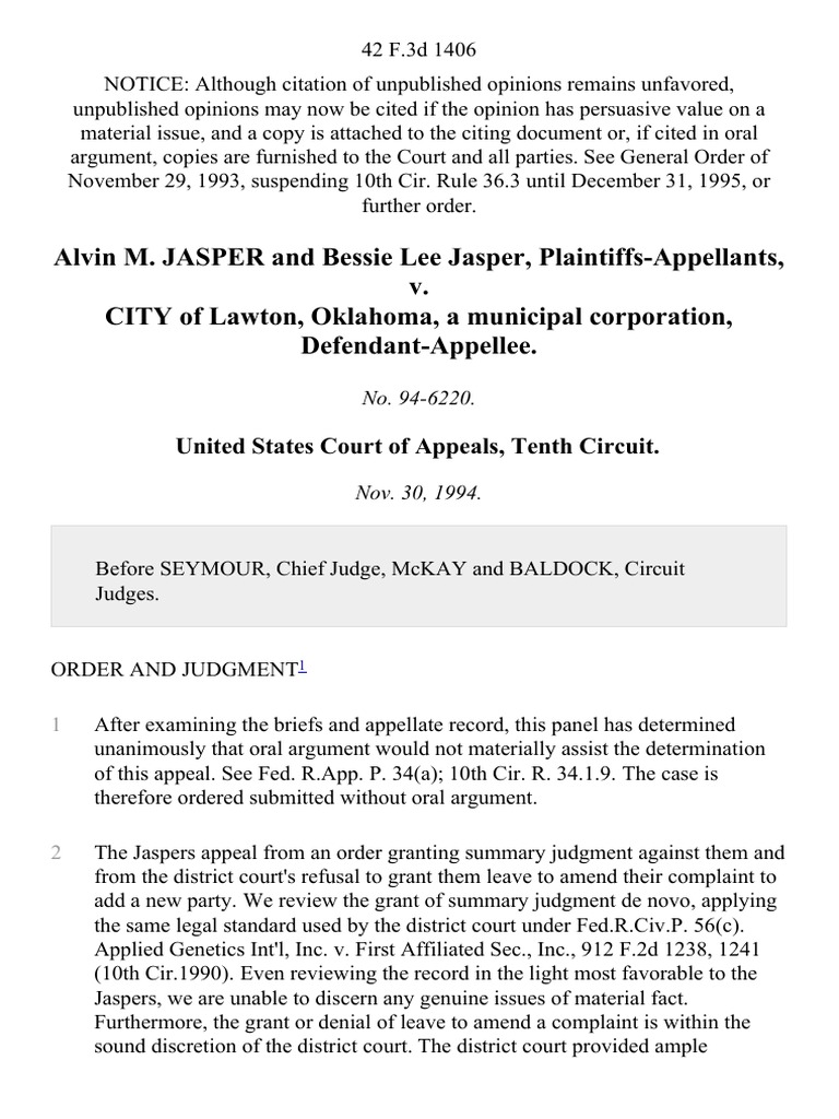 Alvin M Jasper and Bessie Lee Jasper v City of Lawton Oklahoma A