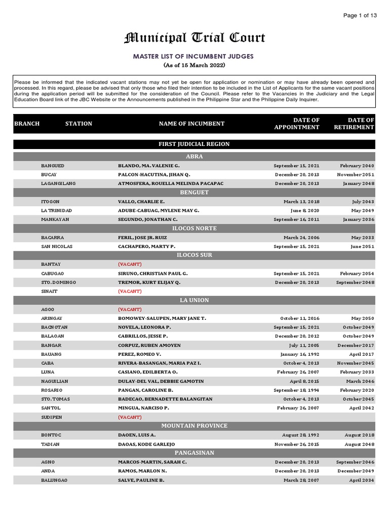 Municipal Trial Court: Master List of Incumbent Judges PDF Public