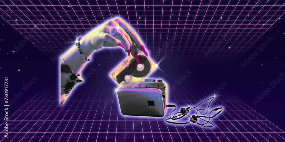 Poster Contemporary art collage Female hand inserts vintage audio