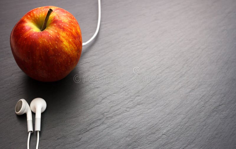 Music Playing Apple in Which Earphones are Connected Stock Photo