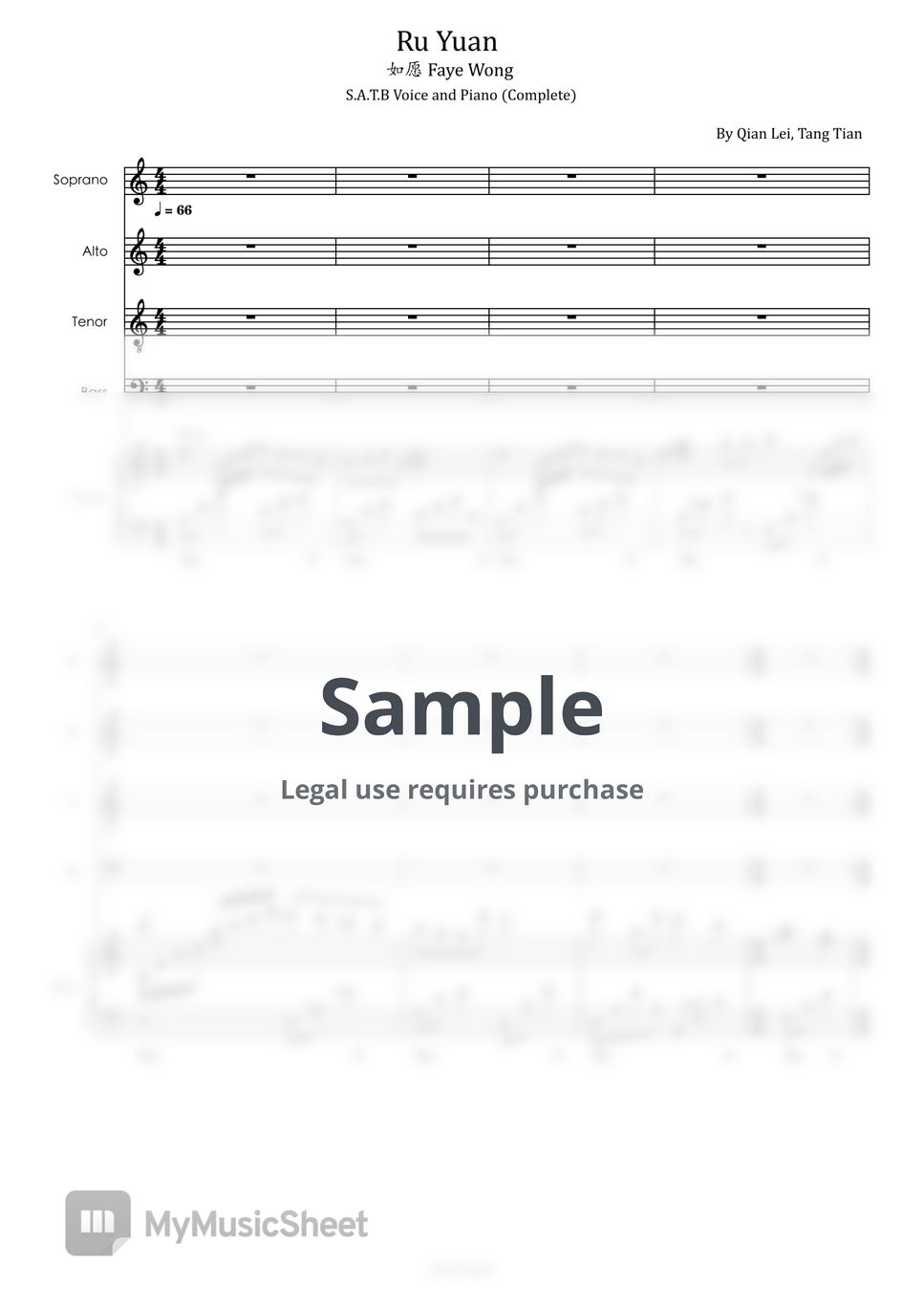 Qian Lei Tang Tian Ru Yuan 如愿 (Faye Wong S A T B Voice and Piano