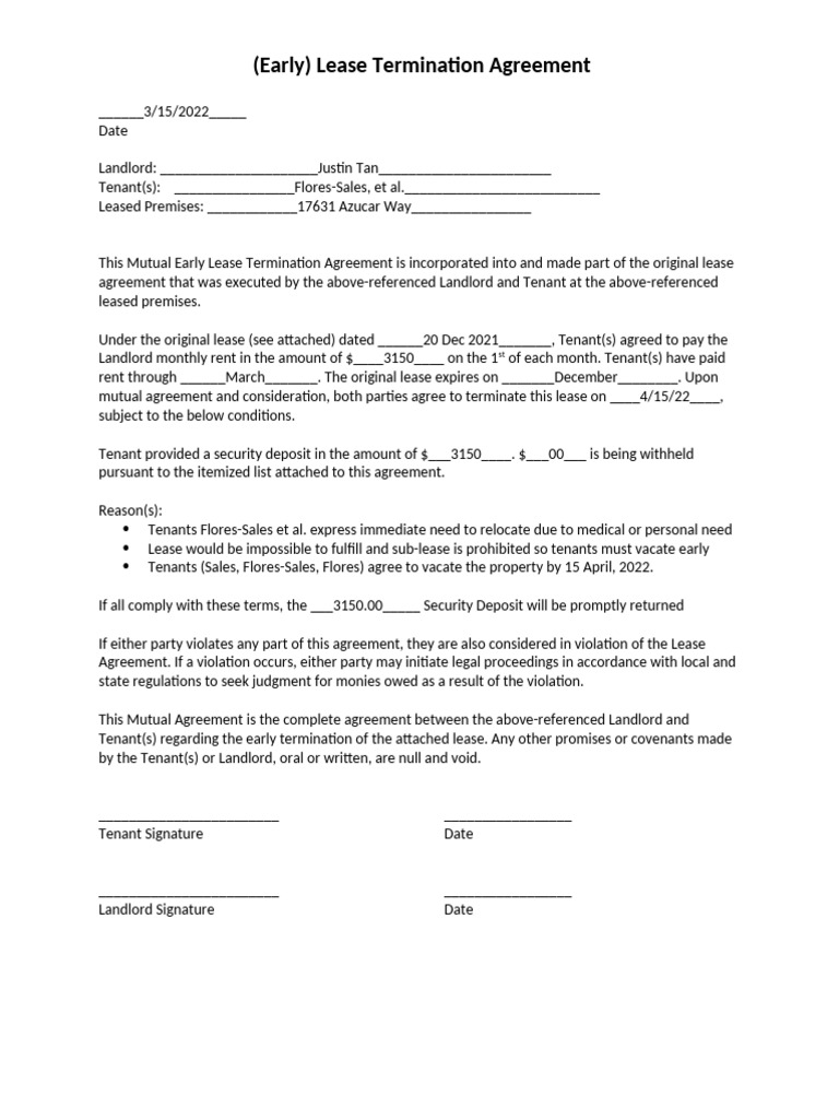 Early Termination Of Lease Agreement Template Infoupdate org