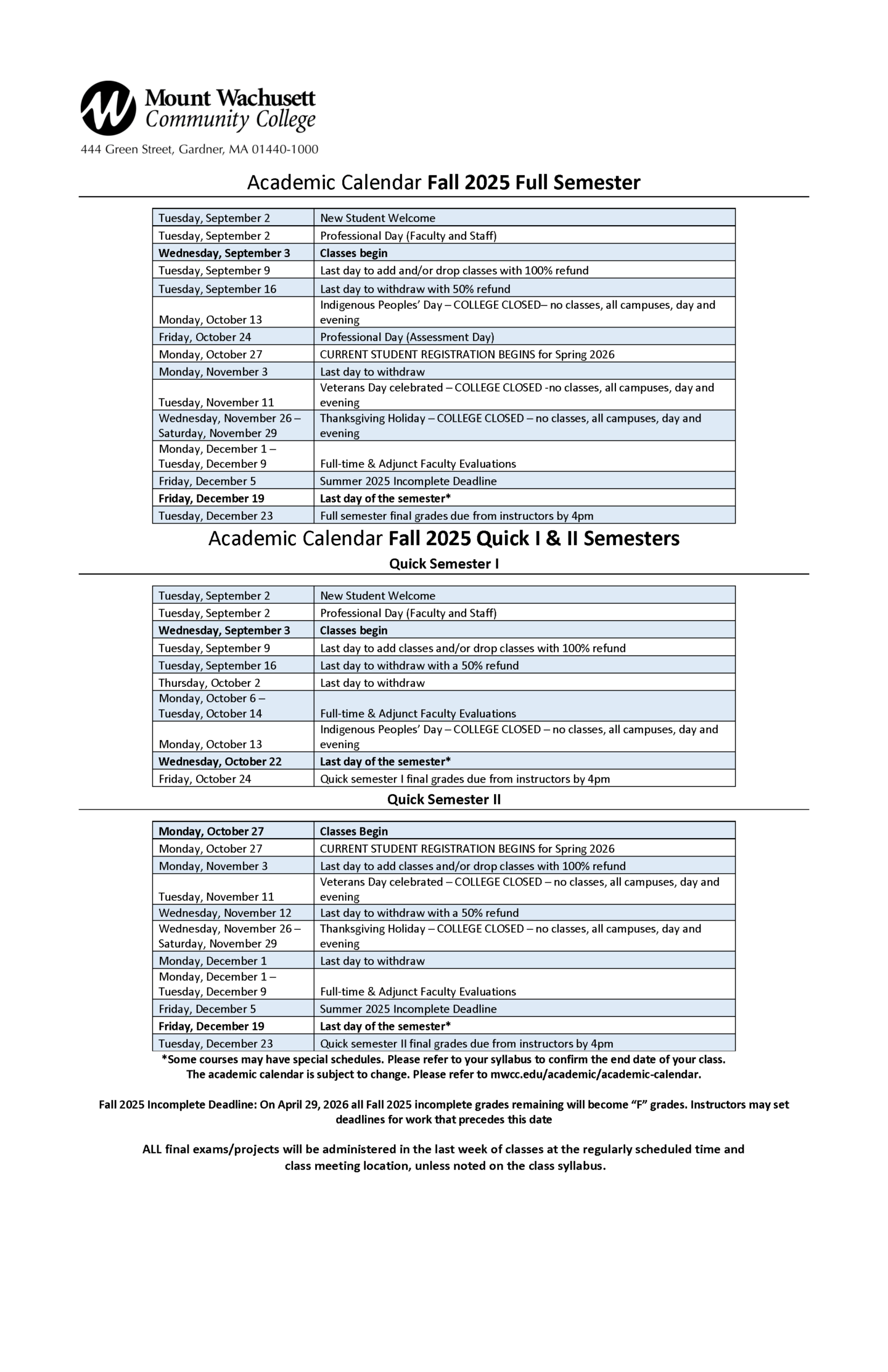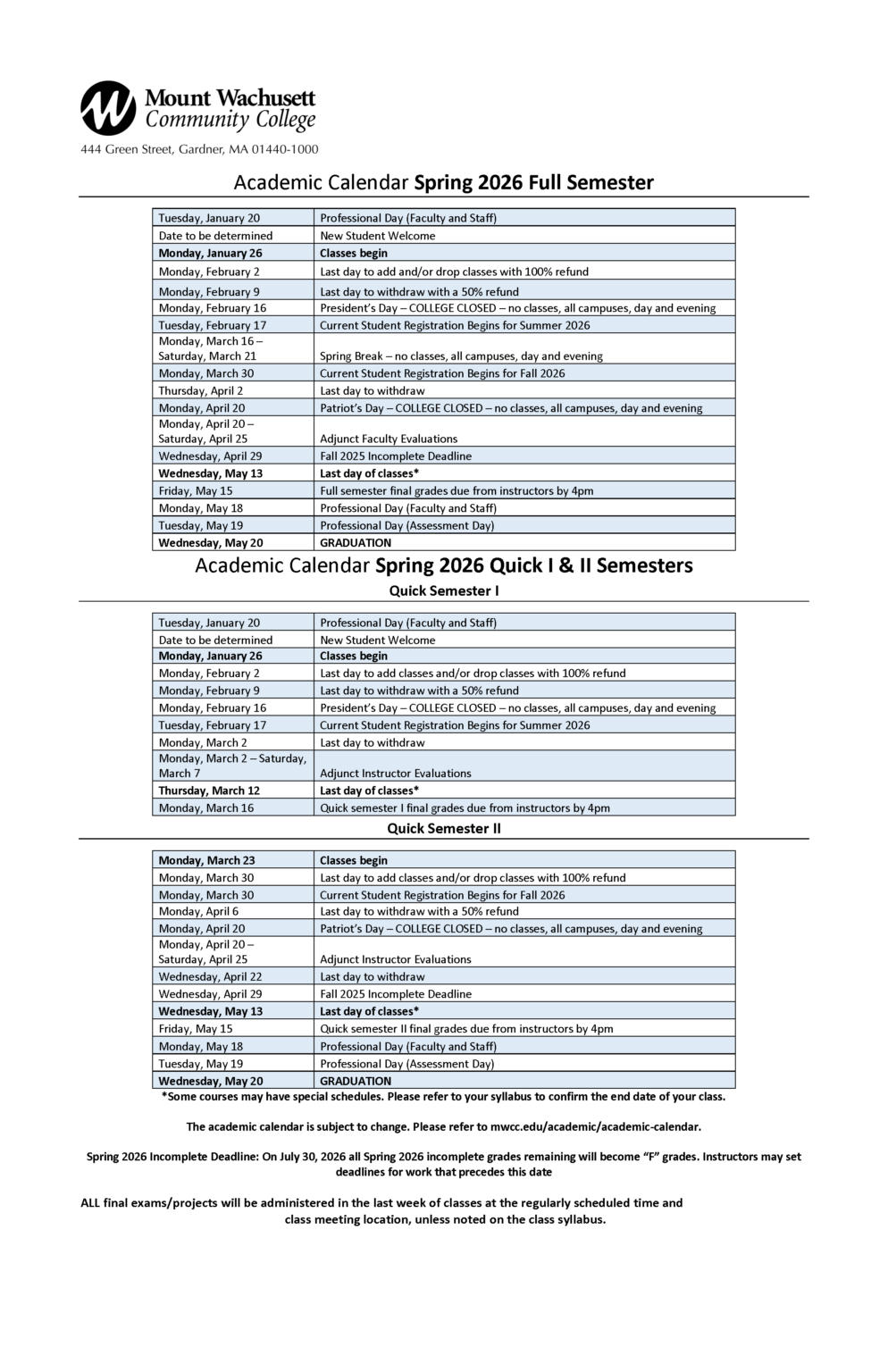 Academic Calendar Mount Wachusett Community College