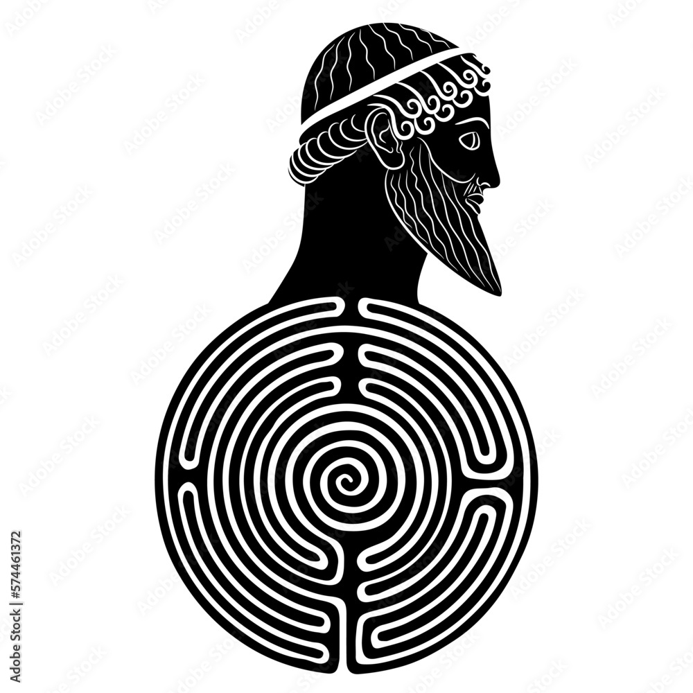 Round spiral maze or labyrinth symbol with a head of bearded ancient