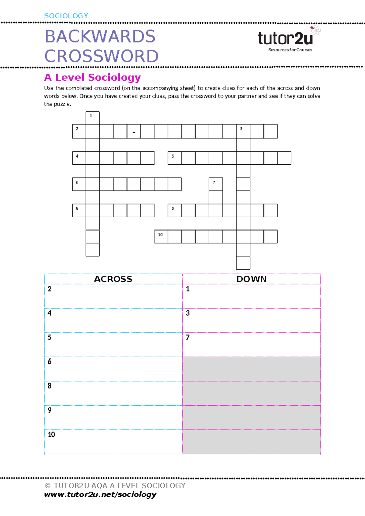 Backwards Crossword Education Resources for Courses BACKWARDS