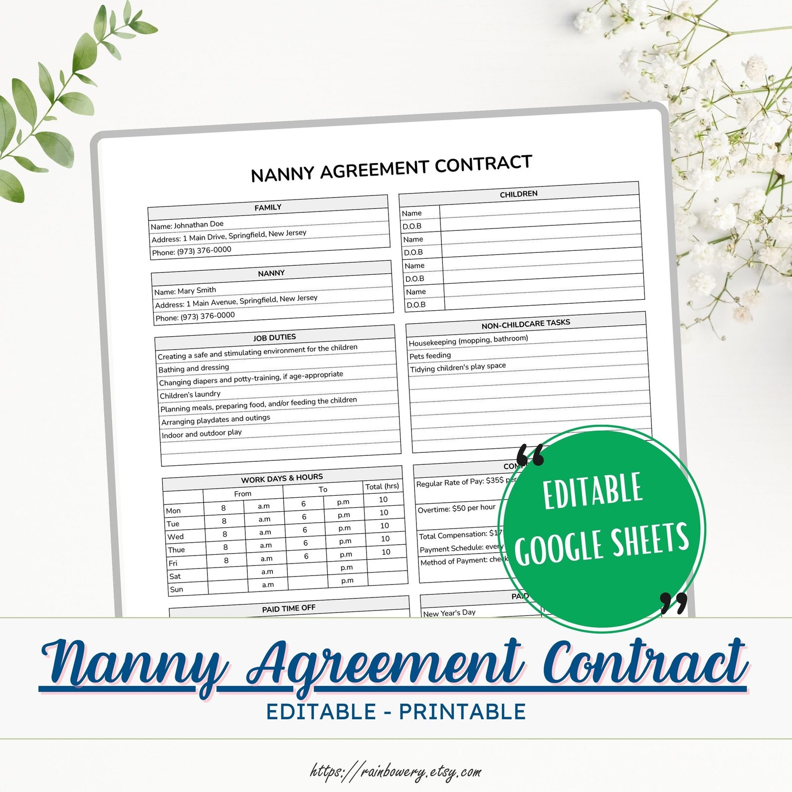 Nanny Agreement Contract Editable Google Sheets Nanny Contract