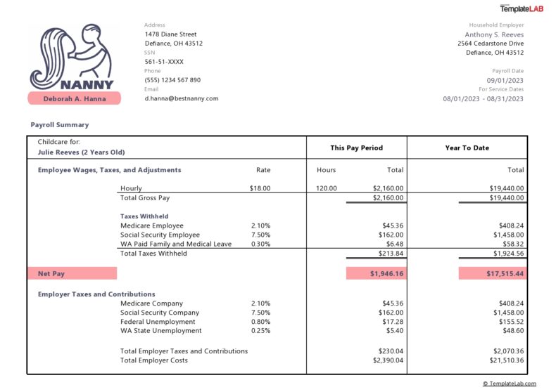 Nanny Pay Stub Template PDF Payroll Tax Labor