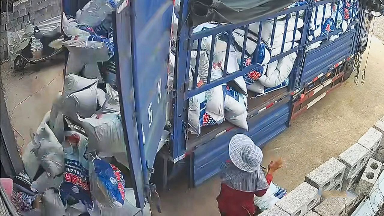 Lucky women narrowly avoid disaster as truck cargo collapses in China