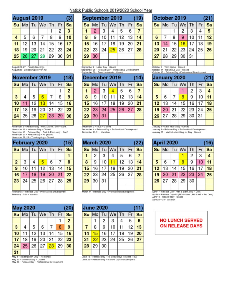 Natick Public School 2019 20 Calendar PDF Holidays Immunology
