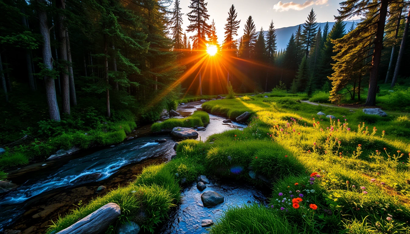 Serene Sunset Over Majestic Mountains and Tranquil Stream in Nature