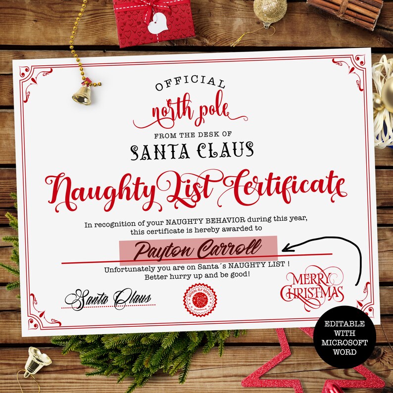 EDITABLE Santa Claus Official Naughty List Certificate Printable
