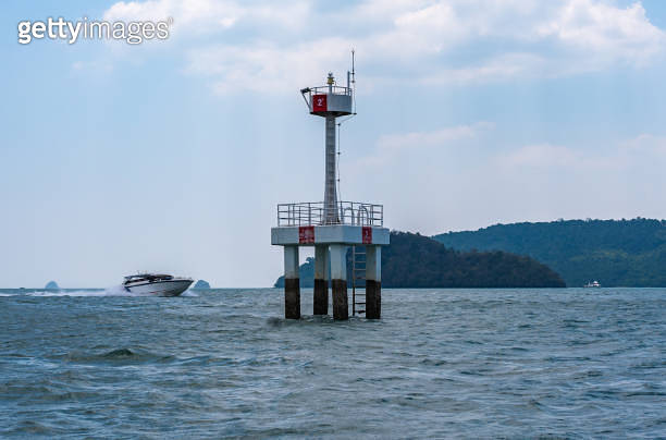 Coastal lighthouse on stilts in sea navigating aid for ships maritime