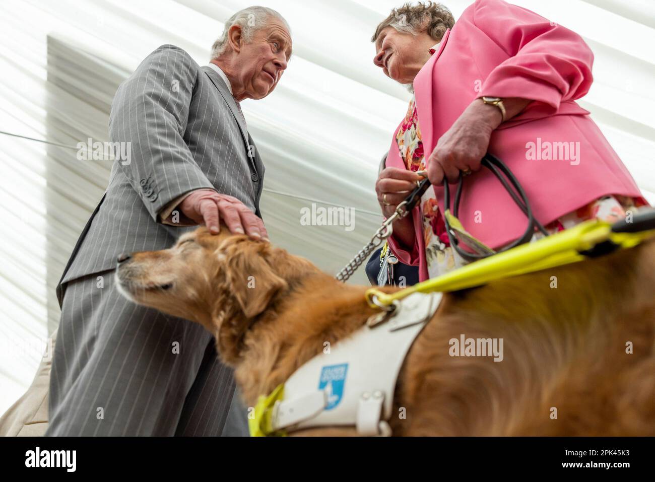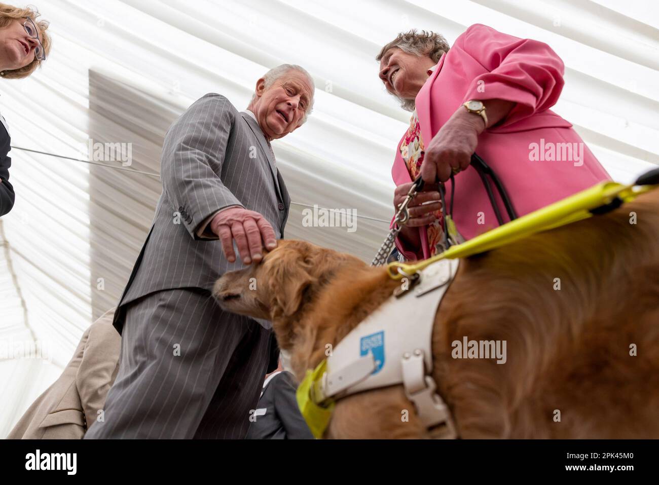 King Charles III meets Ann Ruddick and her guide dog Millie during a