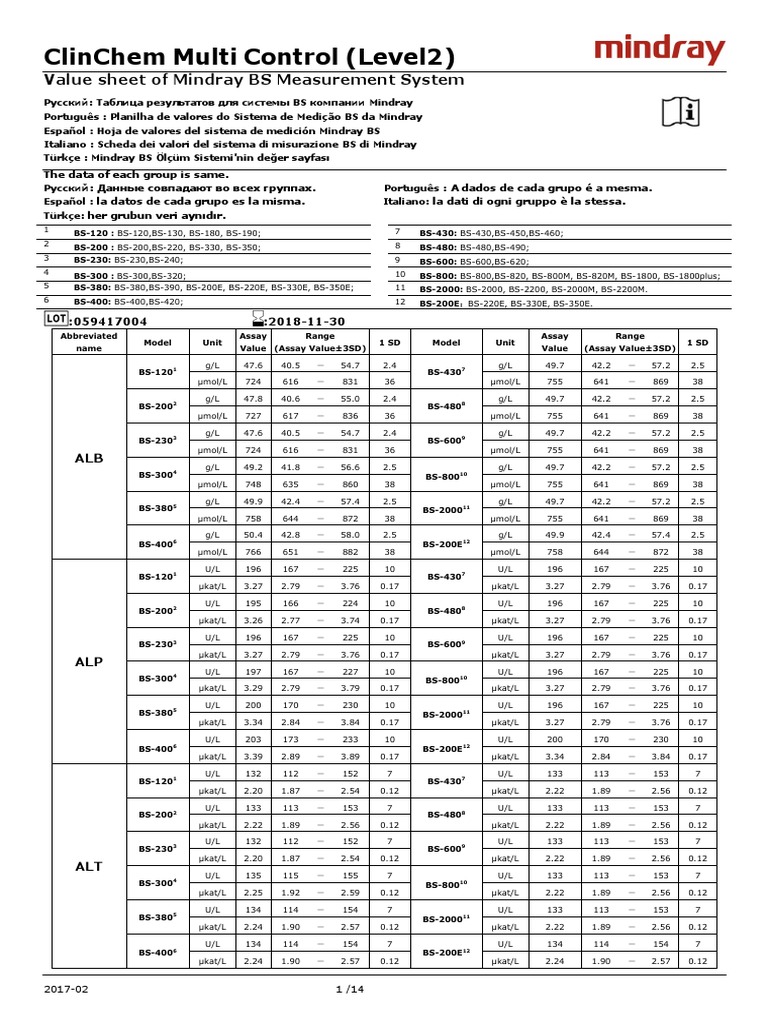 Clinchem Multi Control (Level2) : Value Sheet of Mindray Bs Measurement