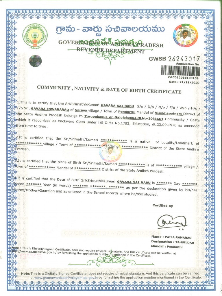 Buy CASTE CERTIFICATE online from CyberSpace