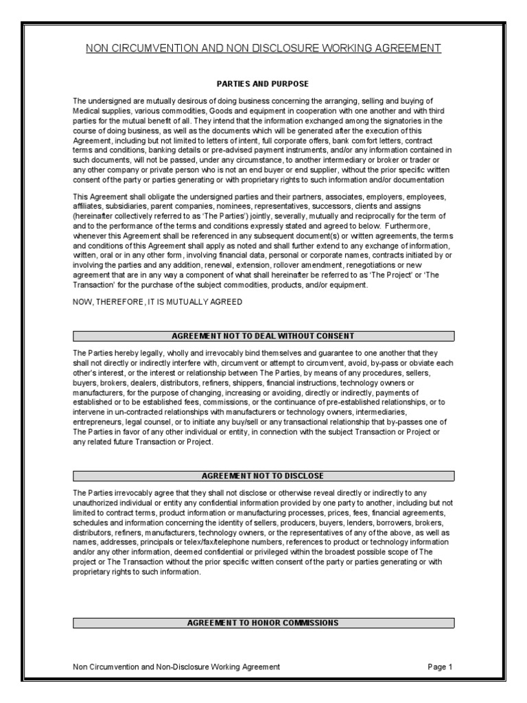 Non Circumvention Non Disclosure Working Agreement (Ncnda