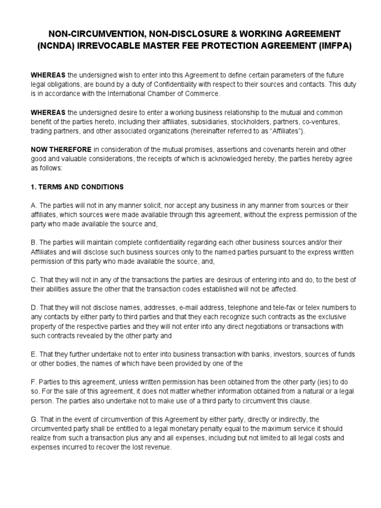 Irrevocable Master Fee Protection Agreement IMFPA NCNDA PDF