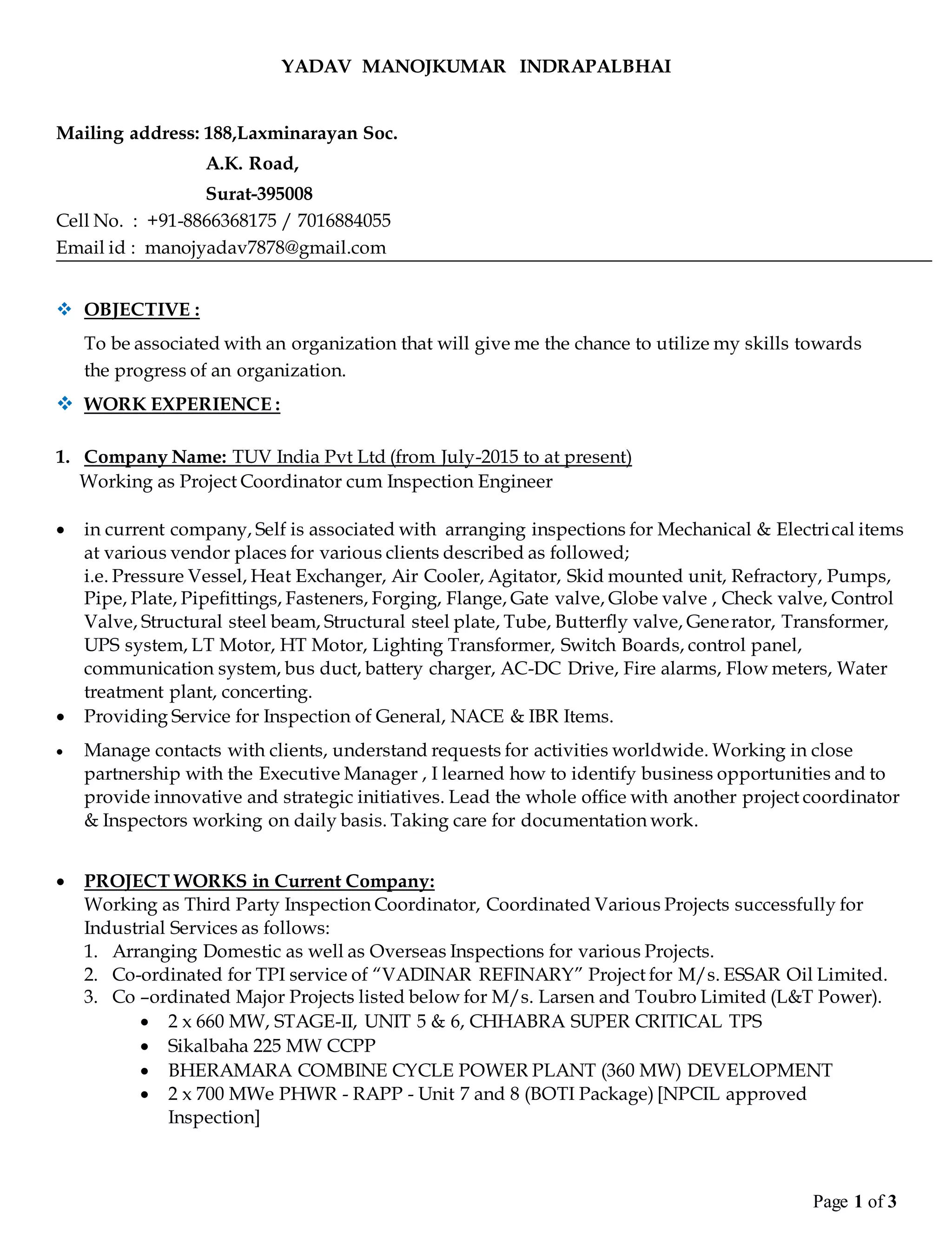 Manoj Yadav Project Coordinatorinspection Engineer (B E