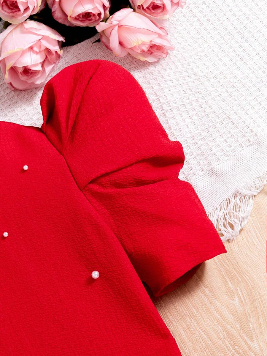 SHEIN Tween Girls #39 Woven Solid Color Round Neck Leg Of Mutton Sleeve
