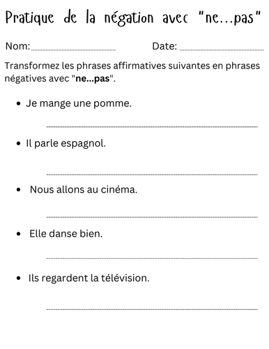 French Teaching Resources Negatives Introduction Worksheet: ne pas