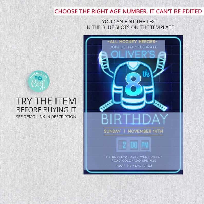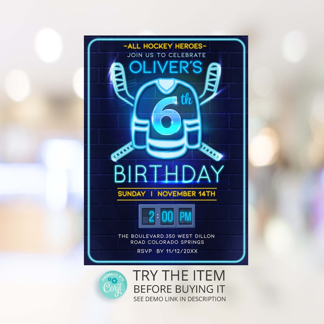Hockey Themed Birthday Neon Invitation Template 8th Birthday Etsy