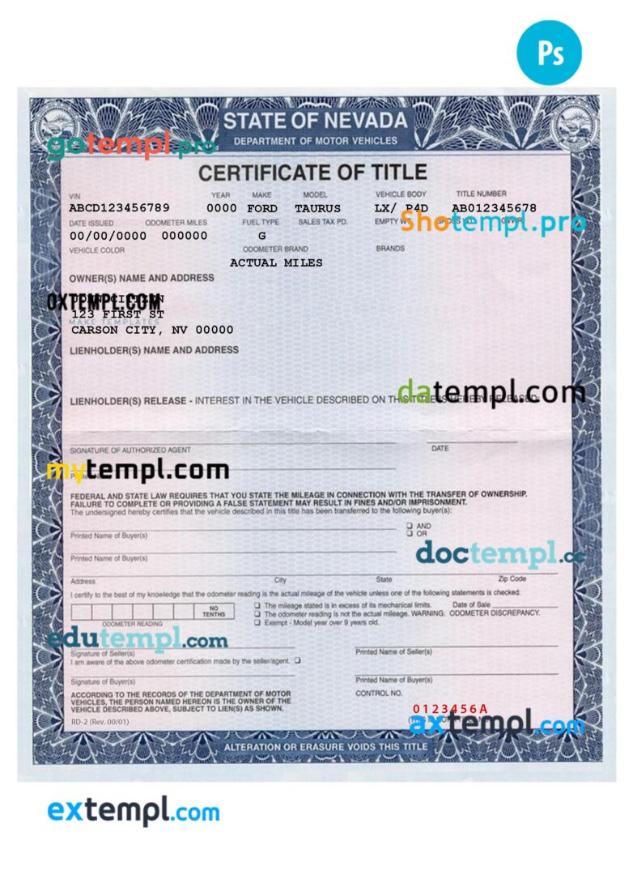 fake Nevada certificate of title of a vehicle (car title) download PSD