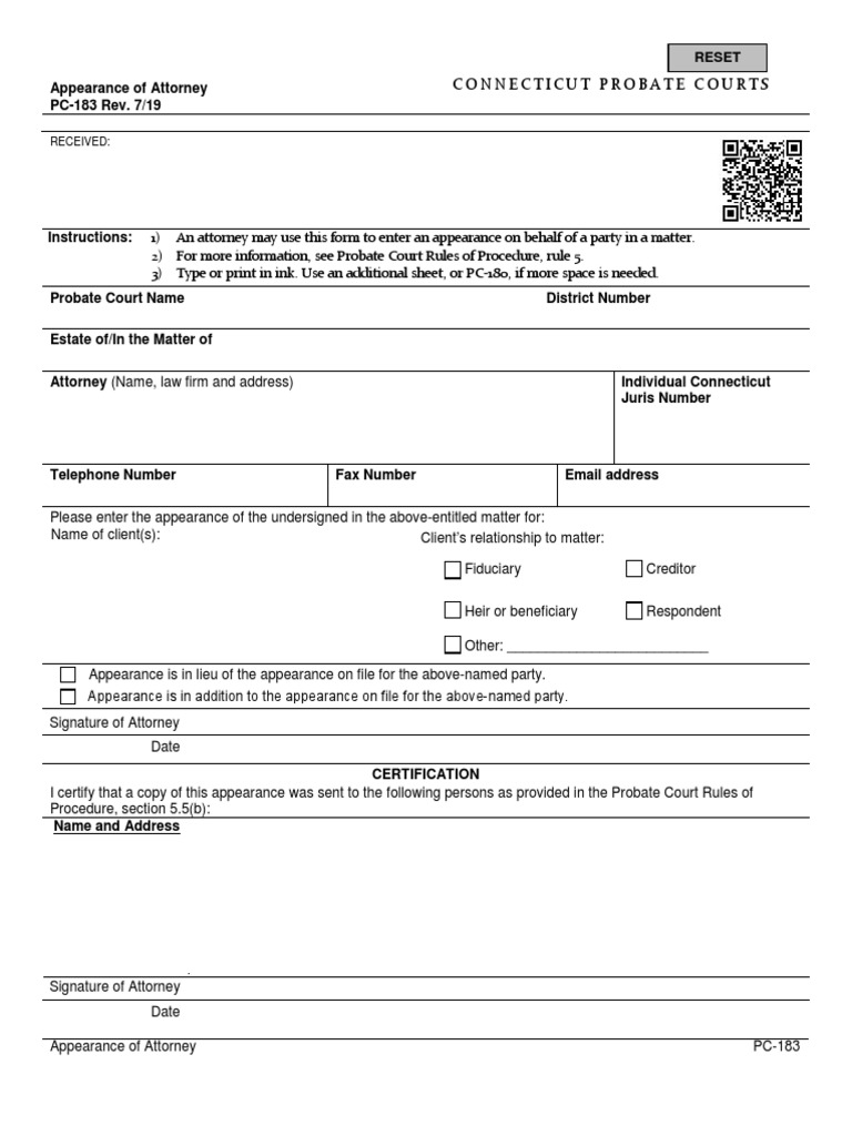 Connecticut Probate Courts: Appearance of Attorney PC 183 Rev 7/19 PDF