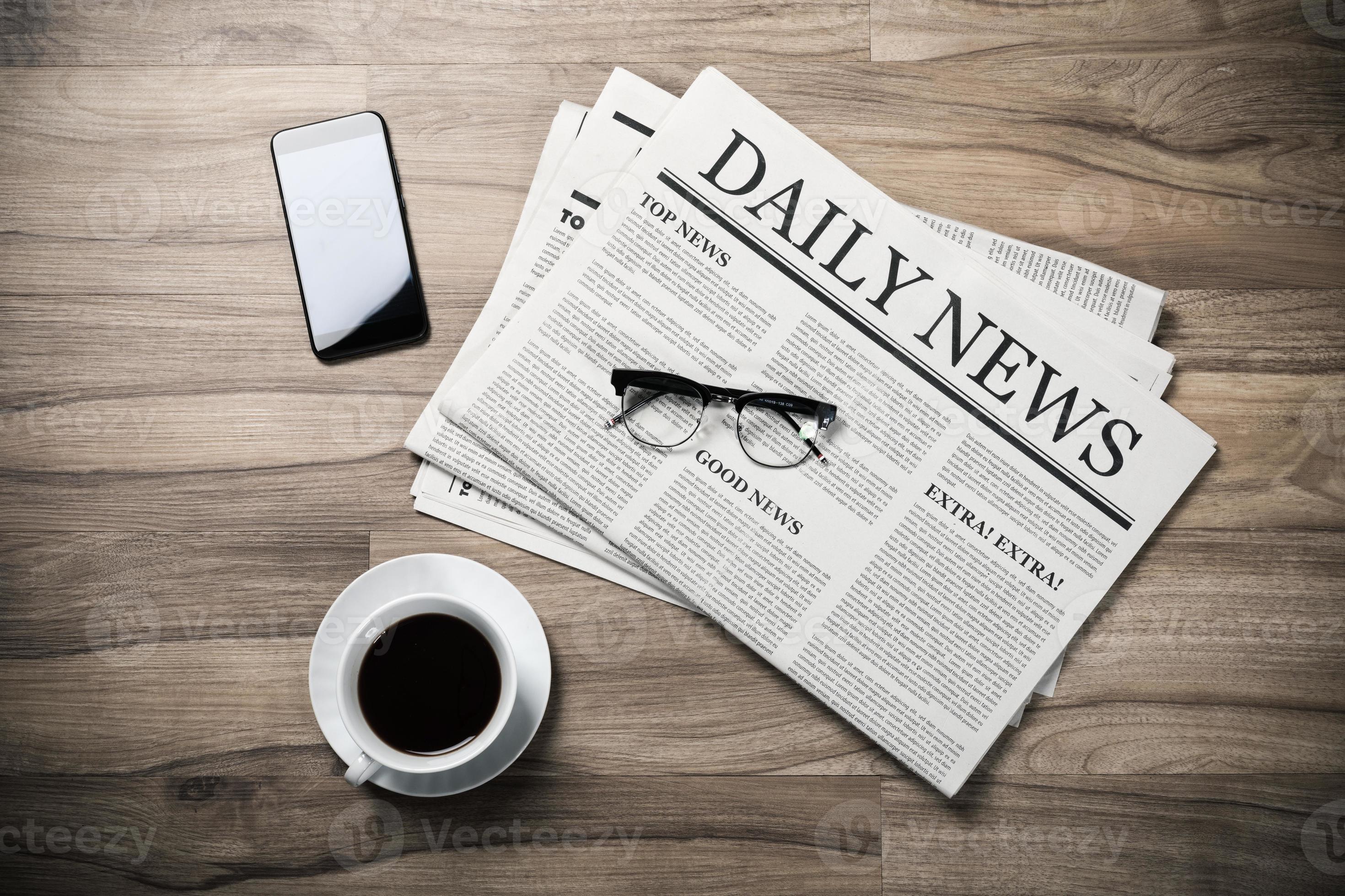 Newspaper with the headline News and glasses and coffee cup on wooden