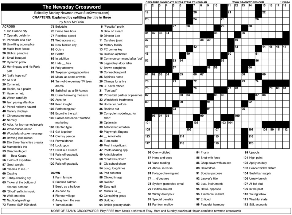 Newsday Crossword Sunday for Nov 17 2024 by Stanley Newman Creators