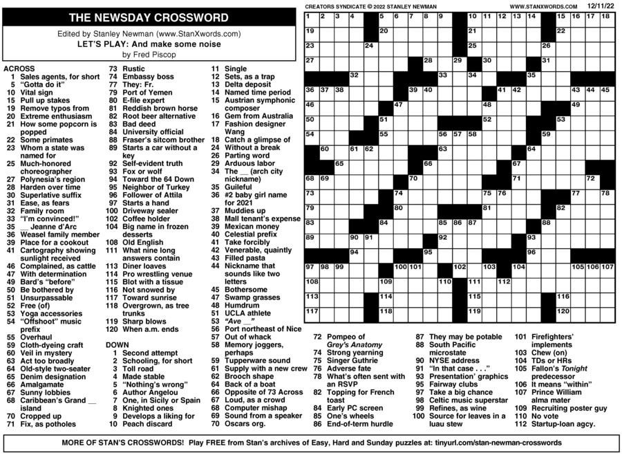 Newsday Crossword Sunday for Dec 11 2022 by Stanley Newman Creators