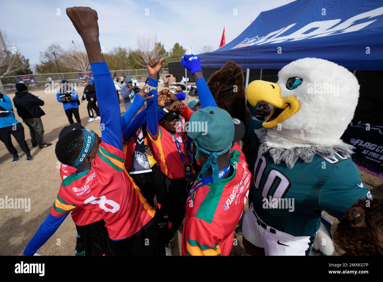 Philadelphia Eagles mascot Swoop cheers with the Ghana flag team during
