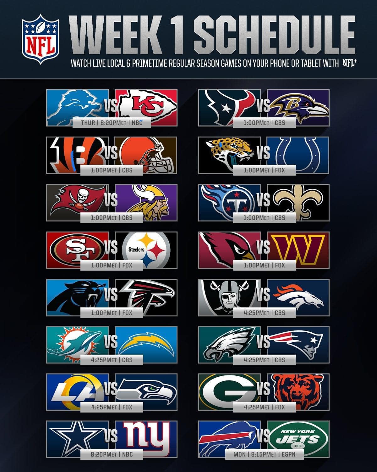 Printable NFL Week 1 Schedule TV Broadcasts and Matchups Printerfriendly