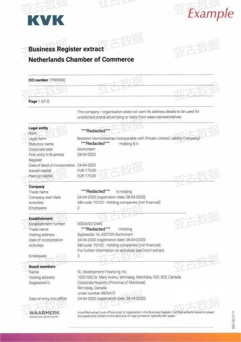 荷兰(Netherlands)公司Good Standing证书 信用资质证书 亚古数据