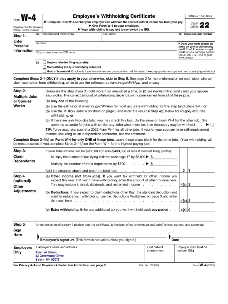 Fillable Online Employee #39 s Withholding Certificate Town of Salem NH