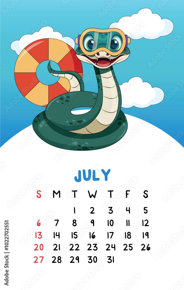 Vector vertical cute July calendar 2025 year with cartoon green snake