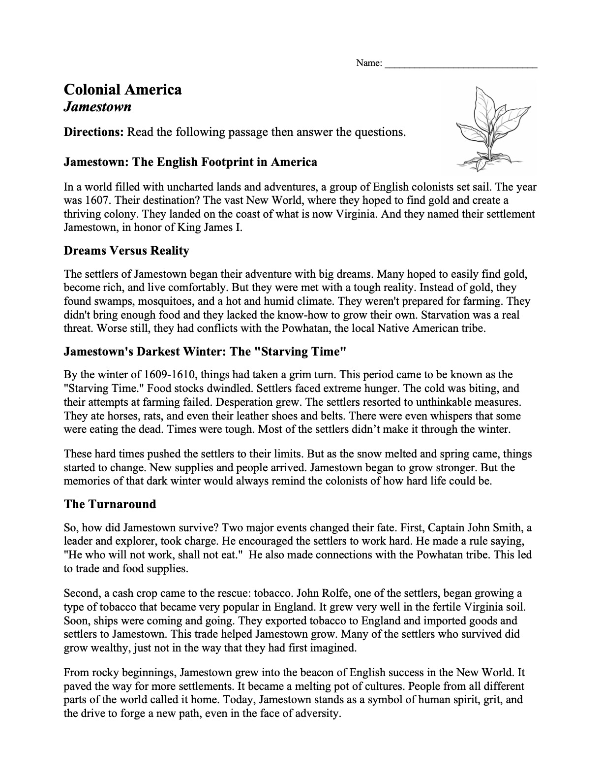 Jamestown Settlement Colonial America Reading Passage Worksheet