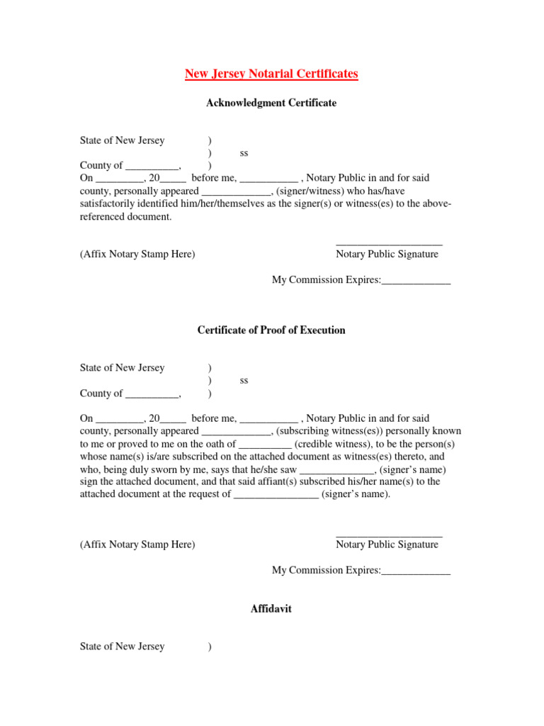 New Jersey Notarial Certificates Download Free PDF Affidavit