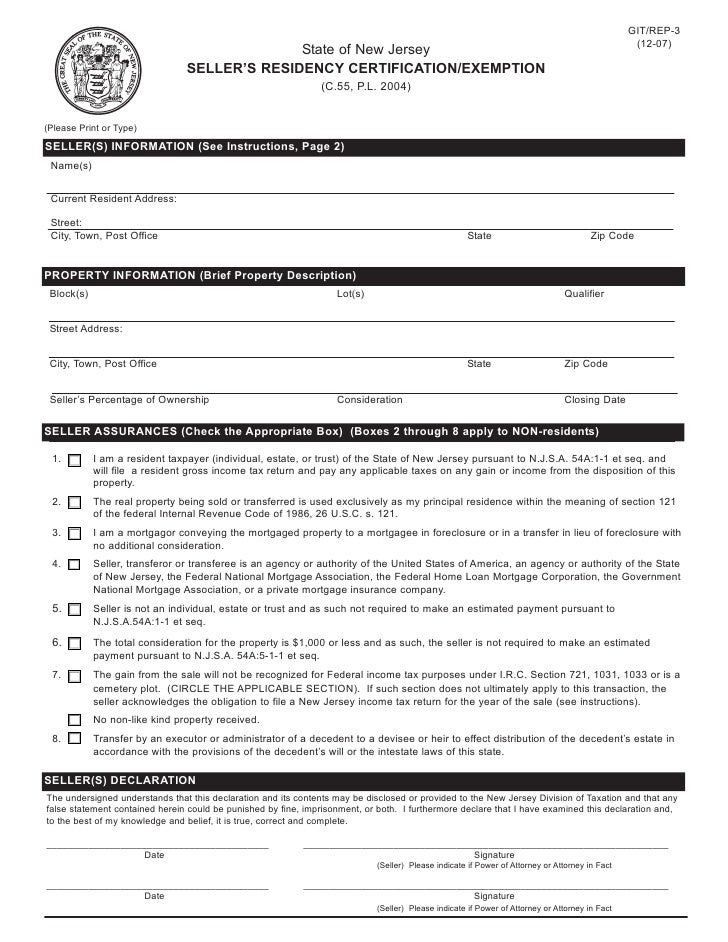Fillable Online GIT/REP 3 (7 04) State of New Jersey SELLER S RESIDENCY