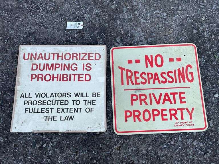 (2) No Trespassing Unauthorized Dumping Signs Aumann Auctions Inc