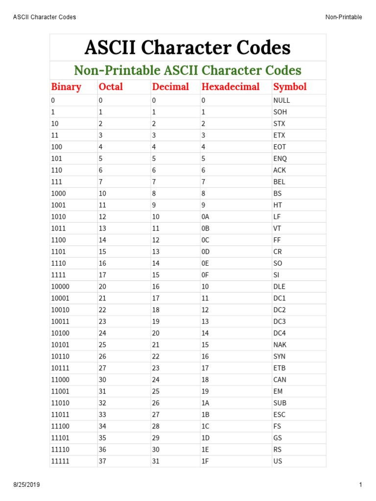 ASCII Character Codes Non Printable PDF