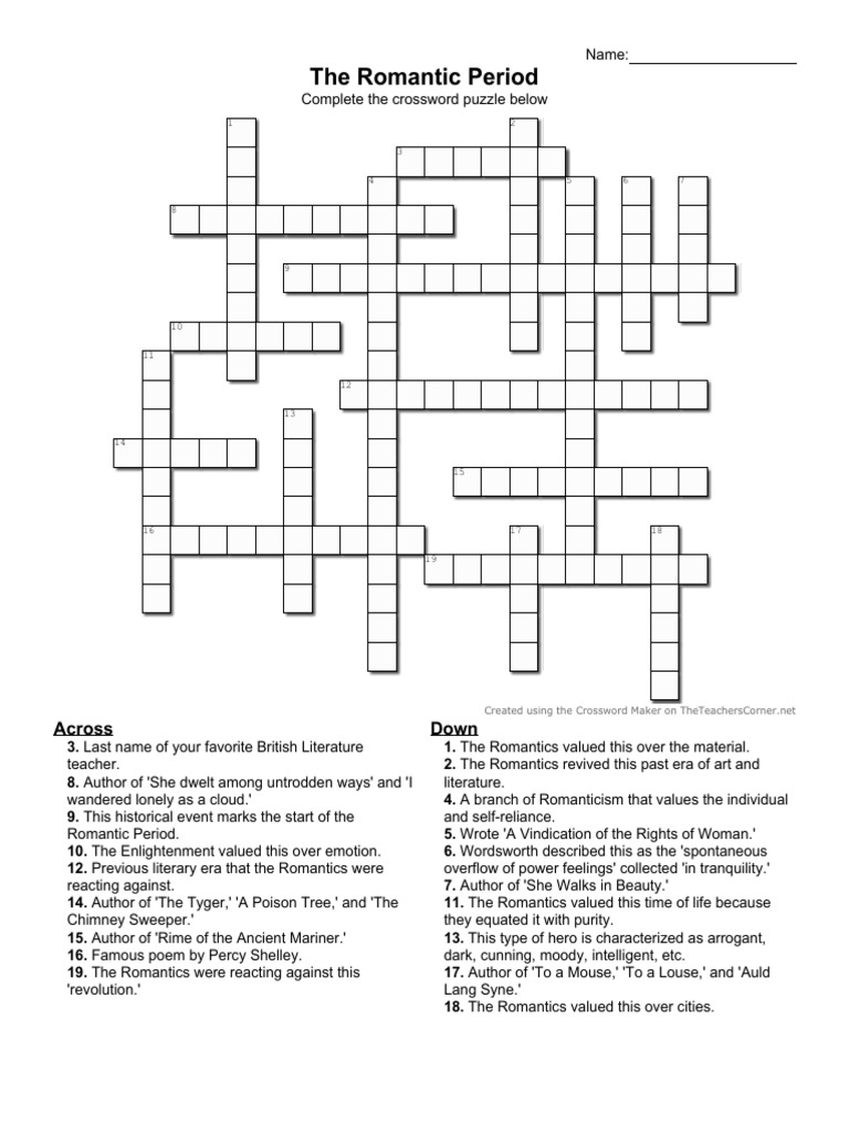 Romanticism Crossword Puzzle PDF Romanticism Poetry