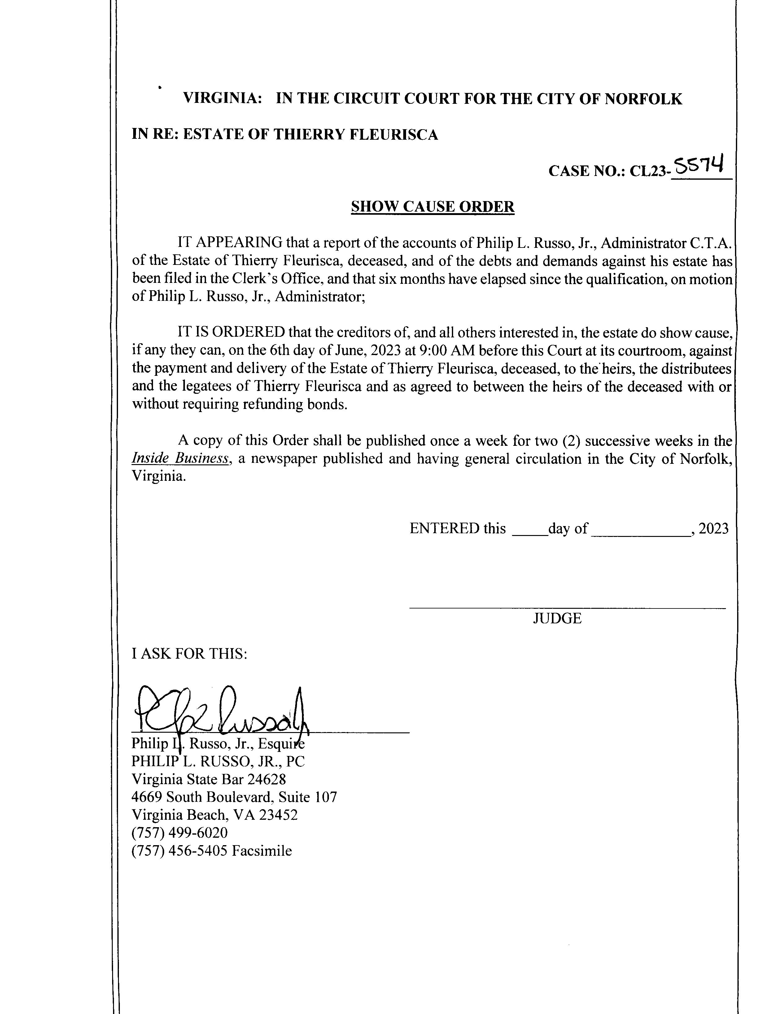 CL23 7461 ORDER OF PUBLICATION by Norfolk Circuit Court Clerk #39 s Office