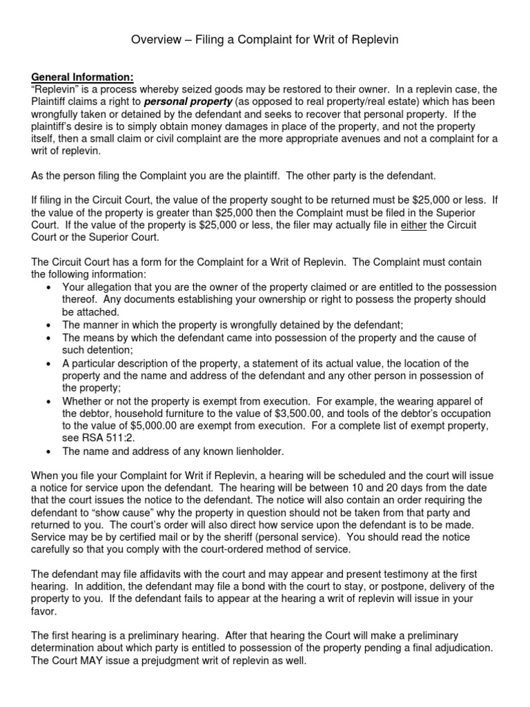 Filing Complaint For Writ of Replevin PDF Complaint Virginia