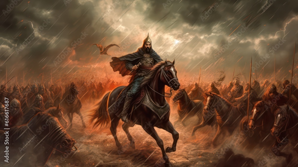 Ottoman sultan on horse looking at the battlefield Generative AI