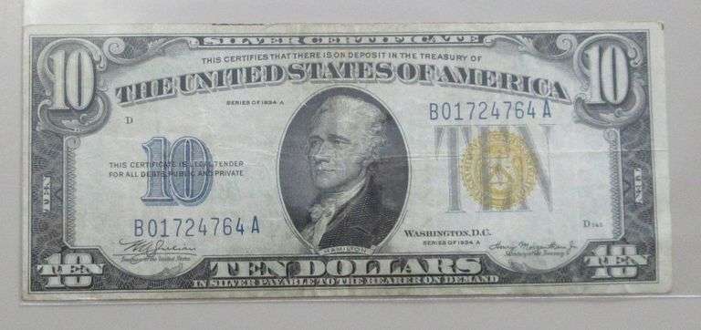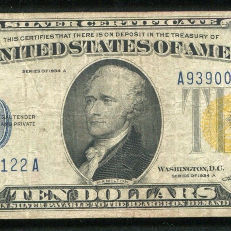1934 A U S $10 Dollar Yellow Seal North Africa Silver Certificate