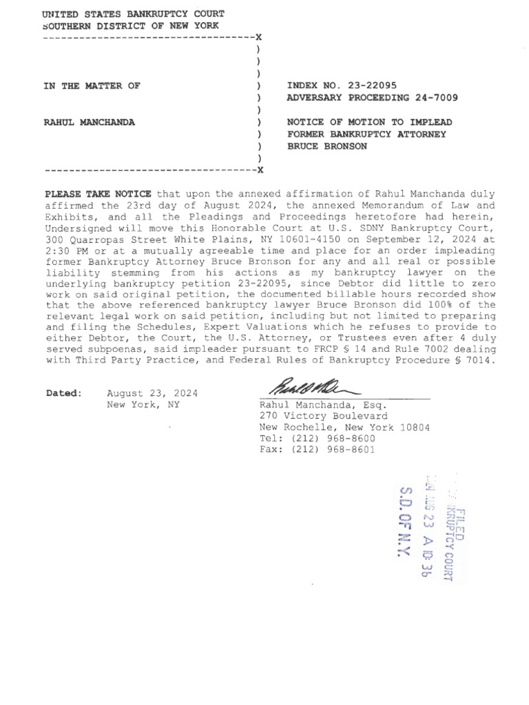 Notice of Motion For Impleader of Former Bankruptcy Counsel Bruce